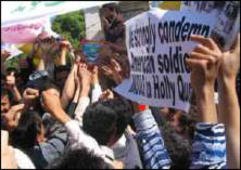 Students demonstrating in Kabul May 12 issued a declaration, saying that the creation of permanent U.S. military bases threatens the independence of Afghanistan.The students' demand -- that the Afghan government deny permanent military bases to the United States -- brings the Koran issue into the country's political arena.The students issued a declaration demanding that President Bush apologize for the alleged desecration, and for the perpetrators to be tried in an Islamic court. |