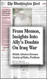 But starting around mid-May, several unusual things happened. All types of media found their mailboxes awash with letters demanding coverage of the Memo; Washington Post ombudsman Michael Getler reported over a thousand in one week alone, which spurred him to peevishly complain about the volume of mail. (Judging from correspondence received by the Albion Monitor and printed in a variety of newspapers, few, if any of those messages were bulk-mailed "astroturf." That would change by the end of the month, however; now all mail we receive about the Memo is astroturf sent from AfterDowningStreet.org coalition sites.) Ombuds from the NY Times and Atlanta Journal-Constitution also commented on the size of the mailbag and attempted to justify their newspaper's Memo snub. We were too busy and anyway, we mentioned it briefly in that British election story, wrote the Times. The AJC ombudsman defended the paper by noting that they run plenty of other stories about Iraq, and anyway, they'll soon have a reporter and photographer embedded with the troops.