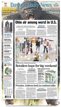 stockholders happy amid continuing declines in readership. Over 2,000 newspaper jobs were lost this year, and the renowned Knight-Ridder chain will likely soon be sold. A Carnegie report earlier this year pegged the average age of a newspaper reader at 53, which started a new round of hand-wringing over the need to be relevant to today's youth. Many assume that translates into the need for more pop culture in their offerings. Several dailies are set to start Japanese-style manga cartoon strips shortly, and in mid-December, the Dayton Daily News simultaneously crossed editorial, advertising, and entertainment borders by turning the layout of the front page into an ad for the Hollywood blockbuster, King Kong. And yes, newsstand sales of that edition were up slightly.