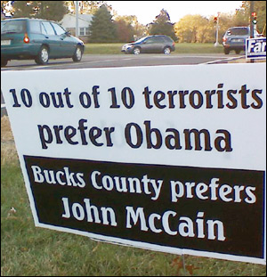 With a new "10 Out Of 10 Terrorists Prefer Barack Obama/Bucks County Prefers John McCain" lawn sign message it seems like the Lords of Loud in talk radio have hit the byways of Bucks County. While the message may be despicable in its fear-mongering, it may be far off the mark as a recent message by Al-Qaida supporters on a web site -- al-Hesbah -- said that they would welcome a pre-election terror attack on the U.S. as a way to usher in a McCain presidency, writing that Al-Qaida will have to support McCain in the coming elections so that he continues the failing march of his predecessor, Bush."
