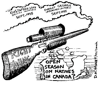 In each case, the right-wing of Canada used the occasion to gain further ground, pointing to the incident as proof that Natives intend to steal their land or livelihood. Even the recent debate over Quebec sovereignty was tainted by racist appeals when one of the separatist leaders criticized Quebec women as responsible for the lowest birth-rate among "white races." To no one's surprise, the Cree tribe, which with the Inuit and others claim about two-thirds of Quebec territory, voted almost unanimously against the separatists. But the most significant legacy of these events might be an emerging militancy on the part of younger Native men and women. "My predecessor, Georges Erasmus, warned in 1988 that if Canada failed to deal with our leadership now, the next generation of leaders would be much more militant," said Ovide Mercredi, national chief of the Assembly of First Nations (AFN), the officially-sanctioned agency which represents all Canadian tribes. "I am truly afraid that day is coming." Mercredi, who helped negotiate settlements at both Gustafsen Lake and Ipperwash, is seen by some as part of the problem. Also in mid-September, a group of Native protesters occupied AFN offices, complaining that it has not given enough support to natives fighting for land rights. A spokesperson said that Mercredi and all government-sponsored chiefs are government employees whose job is to negotiate forever. "These guys [at the barricades] don't see the AFN as a legitimate Indian voice," an expert in contemporary Native issues told a Canadian newspaper. "It is the creation of a foreign instrument of oppression." Unless the events of August and September were a fluke, dangerous times are ahead for Canada. No longer are the Native peoples willing to negotiate for decades, only to have their small gains ignored. The government will have to acknowledge the wrongs of its past and make amends, which is likely to incite the right-wing to further anger and violence. The Canadian press will have to reexamine its willingness to parrot the anti-Native rhetoric from government and police officials. They could begin by asking themselves a few simple questions: were the events at Gustafsen Lake and Ipperwash really just the actions of isolated "radicals" and "nutbars," or could they be part of an emerging civil rights movement? One of the Natives involved with the peaceful surrender at Gustafsen Lake watched as the sundancers were taken into custody. "This isn't the end of the story -- it's the beginning," he said. Nearby on a fence hung a banner that promised what the future may hold. It read: "Mohawk Warrior Society." The same banner was reported at Ipperwash. None of the Canadian press seem to notice the connection. After all, there were no similarities between the two protests at all, in their eyes. |