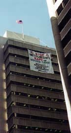 Suspending themselves from the roof of the tower using rock-climbing ropes, activists Donna Parker and Ana Gerhardt opened a 1,225 square foot banner with the message: "Stop Mitsubishi's Rape of Mother Earth -- Boycott Mitsubishi's Bank of California." Plainly visible from the street, the sign was noticed by thousands. Parker and Gerhardt descended to the street of their own accord when evening wind conditions became hazardous. The two women were quickly arrested and charged with trespassing and conspiracy. Also arrested was Kelly Quirke, who acted as a go-between with police and building security. According to a RAN press release, Bank of California -- owned by Mitsubishi Bank -- was the target of the protest because Mitsubishi Bank funds environmentally destructive projects around the world, according to a press release by RAN. RAN holds Bank of California accountable for the harmful practices of its affiliated companies. "I'm risking my life to make this statement," Donna Parker said in a RAN statement, "because if we don't stop companies like Mitsubishi from destroying our rainforests, then everyone's life will be at risk. These companies have loyalty only to their profit margins, and try to make money as fast as possible. We have to let people know what is going on, and that together we can make a difference." Mitsubishi Corporation is one of the largest logging corporations, says the RAN press release. It fully or partially owns timber operations throughout the world, and this deforestation causes the annual loss of millions of plant and animal species while doing immeasurable harm to the indigenous peoples who inhabit those lands. RAN says that every year, an area of rainforest the size of Italy is destroyed, and much of that destruction derives from exploitation by multinational corporations. Compliant governments cooperate with companies to plunder forest land for short-term profit.