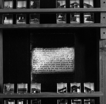 The seven Bay Area artists whose work was inspired by the evacuated homes don't live in the community, says Kathryn Gunther, Director of Arts Benicia gallery. The toxic backyard sludge, erupting from sink holes, that shattered the security of family life in this sunny, Eden-like, small town neighborhood roughly 30 miles north of Berkeley -- a far cry from inner city slums or poorer ethnic suburban enclaves that are known targets of toxic dumping -- has catalyzed a strong response. Alameda artists Trena Noval and James Gouldthorpe, in collaboration with the Busfield family, have created "Home," ("...is where the heart is"), an oral history of the family residence, and metaphor for the lost security that it once represented. Its site-specific component is an audiotape activated by the doorbell at the family's former home, recalling domestic life there; its gallery counterpart is an audiovisual walking tour of the house interior, narrated by Lynn Busfield. Susan Leibovitz Steinman's "Garden for Rose Drive," a second on-site work, calls more attention to the ordinary, four bedroom, two-car garage house, than does its weedy lawn, which breaks rank with the well clipped ones of its empty neighbors, that the developer meticulously maintains. Steinman has plunked cheery flowers into bright yellow-painted tire planters and upturned red, earth-filled mailboxes which obstruct the driveway. These are conventionalized warnings from shrill, traditional suburban icons. The artist softened the family's hard-edged garage door protest, preserved in a photograph displayed at the gallery ("1788 Days and no resolution from Southhampton...") by repainting the door pale blue, streaked with clouds and a quote from Wendell Berry: "The field must remember the forest, the town must remember the field so that the wheel of life will turn and the dying be met by the newborn." Work such as this raises issues that are anathema to small town real estate and tourist industries, serious questions that residents of small suburban towns across America are now facing. Artist Kate Randall, who was growing up near Three Mile Island Nuclear power plant when the accident occurred there in 1978, has contributed "Equations," a piece which details threshold levels of these substances which cause harmful effects in humans. And San Franciscan John Wilson White's "Black Material" simulates a partly constructed house interior on which text excerpts documenting regional land use decisions, are posted eratically between exposed studs; and small, neatly cut-up photos of impacted houses along Rose Drive are asceptically displayed in contiguous, small, flat plastic boxes. Other artists whose work appears in the show have used so- called "waste" in sculptural, kinetic, painterly, photographic, and metaphorical ways, to probe connections between waste management and new technology (including waste-eating plants), create industrial artifacts, and weigh the values of competing land uses.