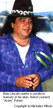 the anniversary of Leonard "Acorn" Peters' death, Bear Lincoln spoke at a twilight ceremony held at the spot where his friend was killed by sheriff's deputies on Good Friday, 1995.