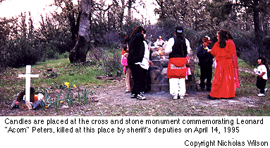 Some 60 people took part in a candlelight ceremony, which proceeded up deeply rutted Little Valley Road toward the shooting site at the crest of a ridge. At the head of the procession moving from the Round Valley Indian Reservation was Roger Peters, teenage son of the slain man. Roger led a traditional Native American drum circle in a sacred ceremony at the exact spot where his father was shot down. In a bullet- scarred scrub oak tree was placed a walking staff festooned with colored ribbons, and at the tree's base, a lone eagle feather and abalone shell holding sage incense were offered. Next to this tree remained the stump of another tree cut down and removed by deputies -- but never accounted for or presented in evidence at Lincoln's murder trial. Roger Peters then placed a commemorative plaque on a stone monument being built to mark the site of "the tragic events of April 14, 1995." Participants placed candles and green ribbons on the monument, along with an adjacent white cross surrounded by blooming yellow daffodils.