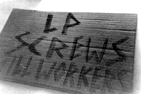 JUDI: Two weeks before I was bombed in Oakland, a bomb partially exploded at the Cloverdale L-P mill. This bomb turned out to have the identical construction of the bomb in my car, absent the motion device. It had the timer, it had the same kind of colors of wires, it had the same solder -- they tested the solder, it was from the same tube of solder. They tested the tape, it was from the same roll of tape. It was made from identical components. And this bomb at the Cloverdale L-P mill, instead of being attached to a motion device and placed in a car, it was attached to a can of gasoline: it was an incendiary bomb, and it's supposed intention was to light the gasoline and burn down the mill. Placed near by -- and this is a strange thing for somebody who intended to burn down a mill -- was a cardboard sign that said: L-P Screws Millworkers. The bomb partially exploded -- in fact, it barely exploded: it exploded just enough to pop off the end cap (there's where your weak end cap is, it's in Cloverdale) -- it popped off the end cap and it dented the can. But it didn't explode the gas can and it didn't burn down the mill. So what it left them with was an intact model of the bomb in my car. That's what was left. This happened two weeks after the bomb school and two weeks before the bomb exploded in my car in Oakland. ![]() Cardboard sign found next to an incendiary bomb that failed to explode found at the Cloverdale, CA, Louisiana-Pacific sawmill. Judi Bari says this is the message she was conveying to millworkers, and she theorizes that the bomb was designed to fail, and the sign was intended to point suspicion at her. Why else would someone put a cardboard sign next to an incendiary bomb, Bari asks. (Police photo, 1990) | |