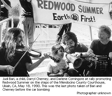 Mississippi Summer in the California Redwoods. JUDI: And it was simultaneously called "Redwood Summer". We used both. We couldn't decide on the name, so in typical Earth First! fashion, we said we'd call it both and see which one sticks. But the images of a Mississippi Summer in the California redwoods was the busloads of students of the sixties riding into the south and attempting to change totally the regional moré. JUDI: We had drawn a parallel: a parallel between the situation we were working in and the early days of the civil rights movement in the south. We felt we really had broad support amongst the general population in the country, but that information was being blocked by what we called the "Redwood Curtain." We felt that if the people of the United States knew that they were clear-cutting the Redwoods and beating up the activists that they would be appalled -- just as the public was appalled when they found out they were beating up black kids in Mississippi. But because of the stranglehold of the timber companies on our local economy and social structure (which we found parallel to the stranglehold of the racists in Mississippi), as long as the crisis remained local, we didn't think we would be able to stop either the violence against us or the violence against the forest. We thought if we could bring in people from all over the nation, we could bring national attention to it and people would be appalled. So we very consciously and deliberately modeled it on campaigns of Freedom Summer in Mississippi, including the call for the use of formal non-violence tactics, in order to combat both the violence being done to the forests and to the activists. That was the image, and I think the image really grabbed people and so we were being deluged with requests to come in. So just from an organizing standpoint, it was very hard to send all the key organizers out of town at the same time. But it was also because of the campaign to discredit us, that I felt like if I were out of town for two whole weeks, things that would be said unresponded to, and the ground we would lose at home would be too dear a price. There were other people who could do the slide shows, give the talks, and even play the music. I felt I was more needed at home -- for one thing, because I was the individual target of these attacks, and I felt I needed to be there to respond to them. And also, I was trying to build support among the watershed groups ... Because there was suspicion among the longer-established watershed groups who had worked hard and long interpreting the new deep ecology ethic along their valleys and ridge roads, the suspicion that all these people coming in would mean twenty-year long relationships with straight neighbors down the drain, because of these nomadic and somewhat more feral Earth First!ers. JUDI: Yes. And I felt I needed to personally be there, because it was my neighborhood, that it had to be somebody who already knew the people in these communities. I felt that the place I needed to be was home. | |