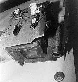 ![]() Police photo of the actual dud bomb recovered from the Louisiana-Pacific sawmill at Cloverdale shortly before the Bari car-bombing. Note the fractured end cap from the pipe bomb lying on the floor. Next to the pipe bomb is a metal can of gasoline for incendiary effect. This bomb was built in a way almost identical to the bomb in Bari's car, except for lacking the motion trigger and adding the gas can. Bari believes this bomb was intended to fail to explode so as to point suspicion at her by way of the slogan painted on a cardboard sign found next to this incendiary bomb. This bomb was placed two weeks after the FBI conducted a bomb investigation training school in Eureka and two weeks before the bombing of Judi Bari. Police photo 1990 |
