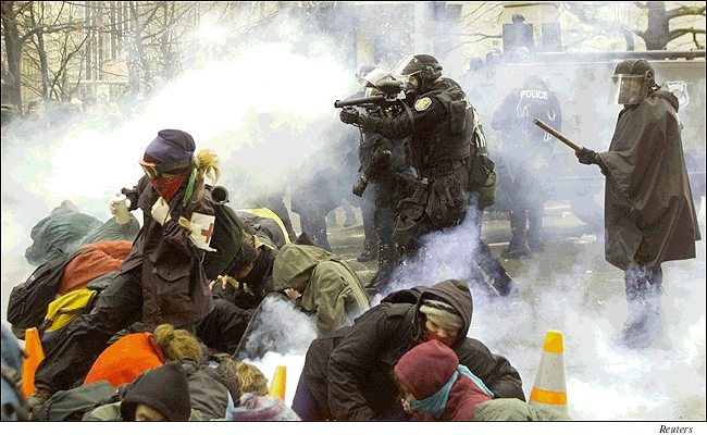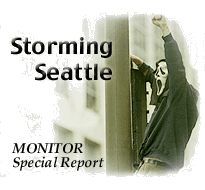Welcome to Seattle Washington, as dawn rises on Tuesday, November 30, 1999, and about five hundred members of law enforcement prepared for duty. Sharing their own moments of stillness are about 35,000 protesters plus 15,000 members of organized labor. The police are outnumbered 10 to 1. The evening before, the forces had aligned themselves into camps. There was the Direct Action Network (a coalition of enviro and human rights groups), which planned to shut down the WTO conference by swarming the streets. There was the AFL-CIO, which planned to hold a rally and parade in an effort to influence national trade policy -- and the upcoming presidential elections. There was the Seattle Police Department, tasked with preventing the protests while allowing the labor parade. There was the camp of outside law enforcement agencies, champing at the bit to enter into the fray -- but as long as the SPD maintained order, they would be forced to sit on the sidelines. And milling around the edges were the Black Blocs, fondling their crowbars and dreaming of chaos. What would happen next was anybody's guess -- but as old veterans say, no plan of battle survives contact with the opposition. We present the story of the Battle of Seattle in 20 parts, meant to be read in sequence. Please don't skip ahead; each section builds on important details revealed before. |